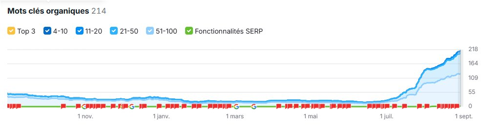 Si SemRush n’est plus à mon sens le meilleur outil pour « évaluer » un site notamment francophone, il n’en demeure pas un outil SEO majeur. La progression des mots-clés positionnés est régulière, et plus les semaines passent, plus ce positionnement semble efficace (sans doute grâce à un maillage interne optimisé).