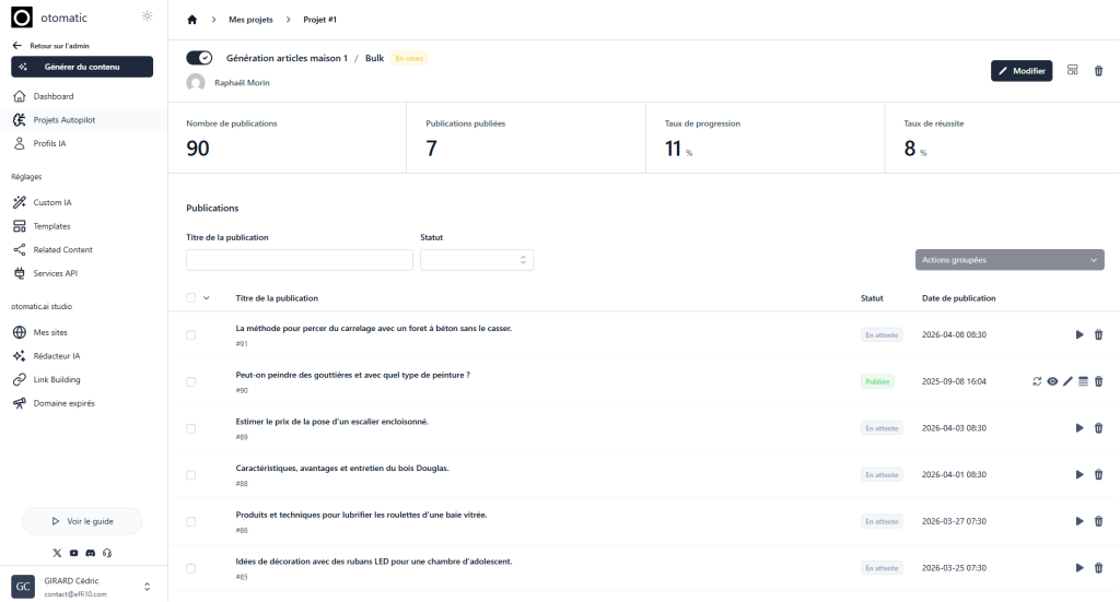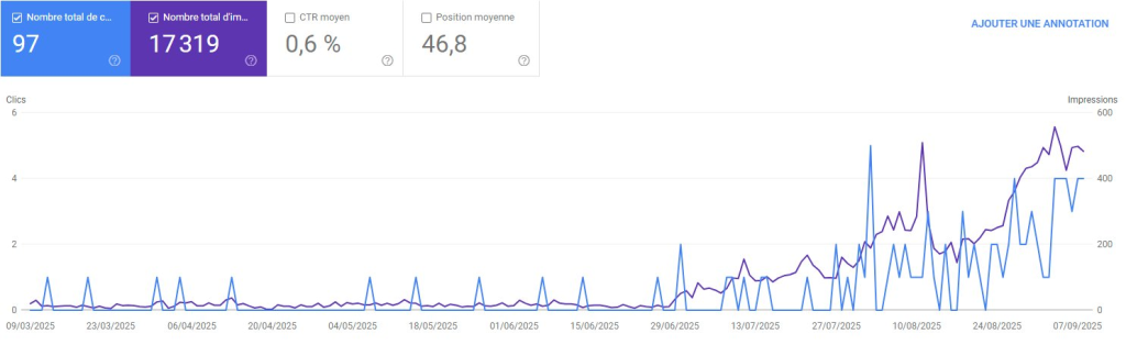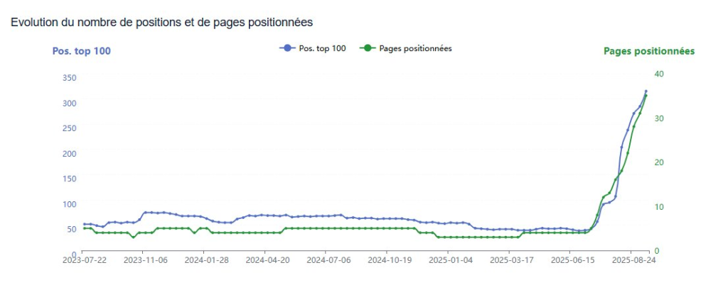 La mise en place d’Otomatic a été réalisée fin juin 2025. Une première campagne de 3 semaines (à hauteur de 3 articles par semaine) a permis de lancer la machine, et depuis fin juillet, c’est à un article par jour que le processus suit son court. Le résultat est sans appel !