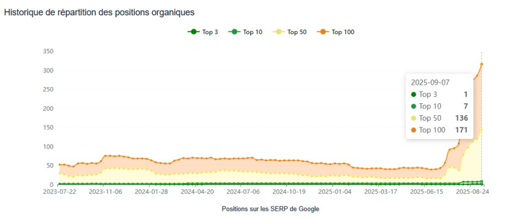Au niveau du positionnement d’après Haloscan, là encore les données sont intéressantes : au 7 septembre 2025, 7 mots-clés se positionnent en TOP 10 (pour un site avec 4 RD indexés, pas mal !)