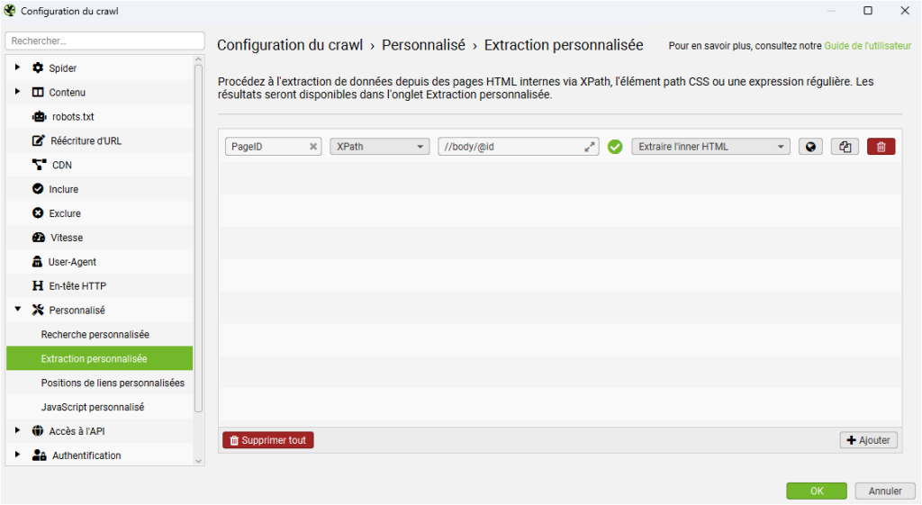 La mise en place se déroule en deux temps. D’abord, il faut configurer l’extraction via Configuration > Custom > Extraction. On y définit ce que l’outil doit extraire, par exemple l’attribut class de la balise <body>. Ensuite, après avoir relancé un crawl pour que Screaming Frog collecte ces nouvelles données, on peut utiliser les informations extraites dans la configuration des segments. Sur un site WordPress, par exemple, les articles de blog contiennent souvent la classe postid- dans la balise body, tandis que les pages contiennent page-id-.