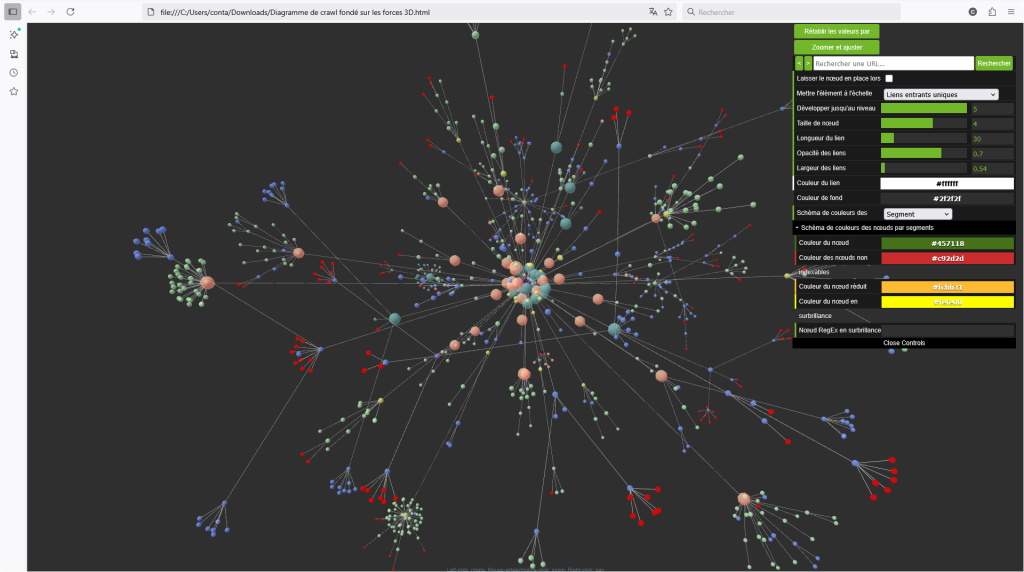 La véritable puissance de cette approche se révèle lors de l’utilisation des outils de visualisation. Les diagrammes de crawl, notamment la « 3D Force-Directed Graph », utilisent un code couleur basé sur les segments. Cette représentation visuelle de l’architecture du site met en évidence la structure des liens internes et les relations entre les différentes typologies de pages. Une analyse visuelle permet de déceler rapidement plusieurs anomalies potentielles :